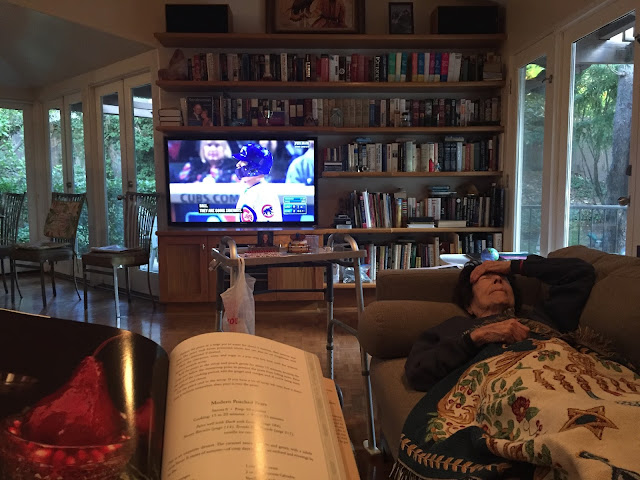 Other games I watched like a normal mere mortal, on the couch. This happens to be Dewey's Readathon dat where I tried valiantly to take part -- thus there I am, reading A Feast of Ice and Fire (cookbook based on the Game of Thrones series by George R.R. Martin -- and both an interesting-ish read and a good cookbook). That's Gramma Rose there to the left. She's been declining, but at 101 you make allowances and she wanted to hang out "with her beautiful girls" (she has very rosey glasses-- lol) while we yelled at the TV.